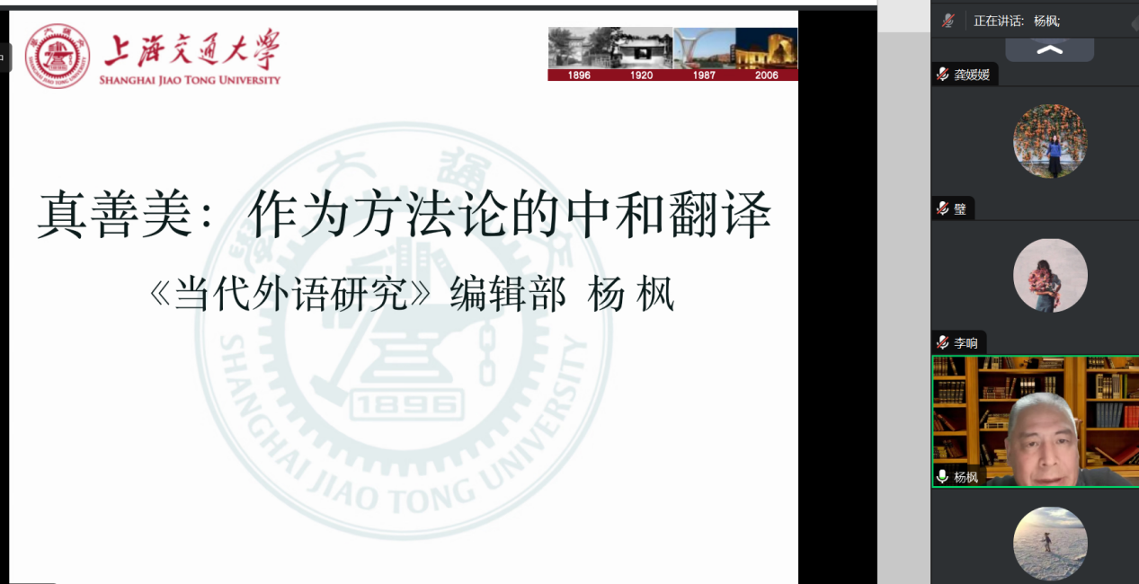 本网讯 2023年12月19日,太阳成集团tyc411翻译系“三进”专题教研活动系列讲座“什么是中和翻译”在线上顺利举行。《当代外语研究》主编、上海交通大学外国语学院博士生导师杨枫教授担任主讲嘉宾,太阳成集团tyc411翻译系主任潘莉教授担任主持人。