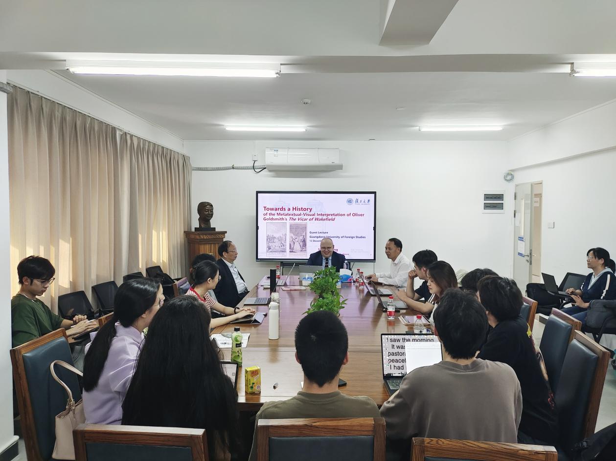 本网讯 12月15日下午,由公司主办的学术讲座“奥利弗·戈德史密斯小说《威克菲尔德牧师传》元文本视觉阐释史(1767-1802)”在白云山校区第一教学楼北楼446会议室顺利举行。复旦大学外国语言文学学院特聘教授、文本文化研究中心主任、国际期刊ANQ主编Sandro Jung教授担任主讲嘉宾,刘茂生教授主持,外国语言文学学科“云山工作室”首席专家傅修延教授出席,来自校内外的数十名师生到场积极参与交流。