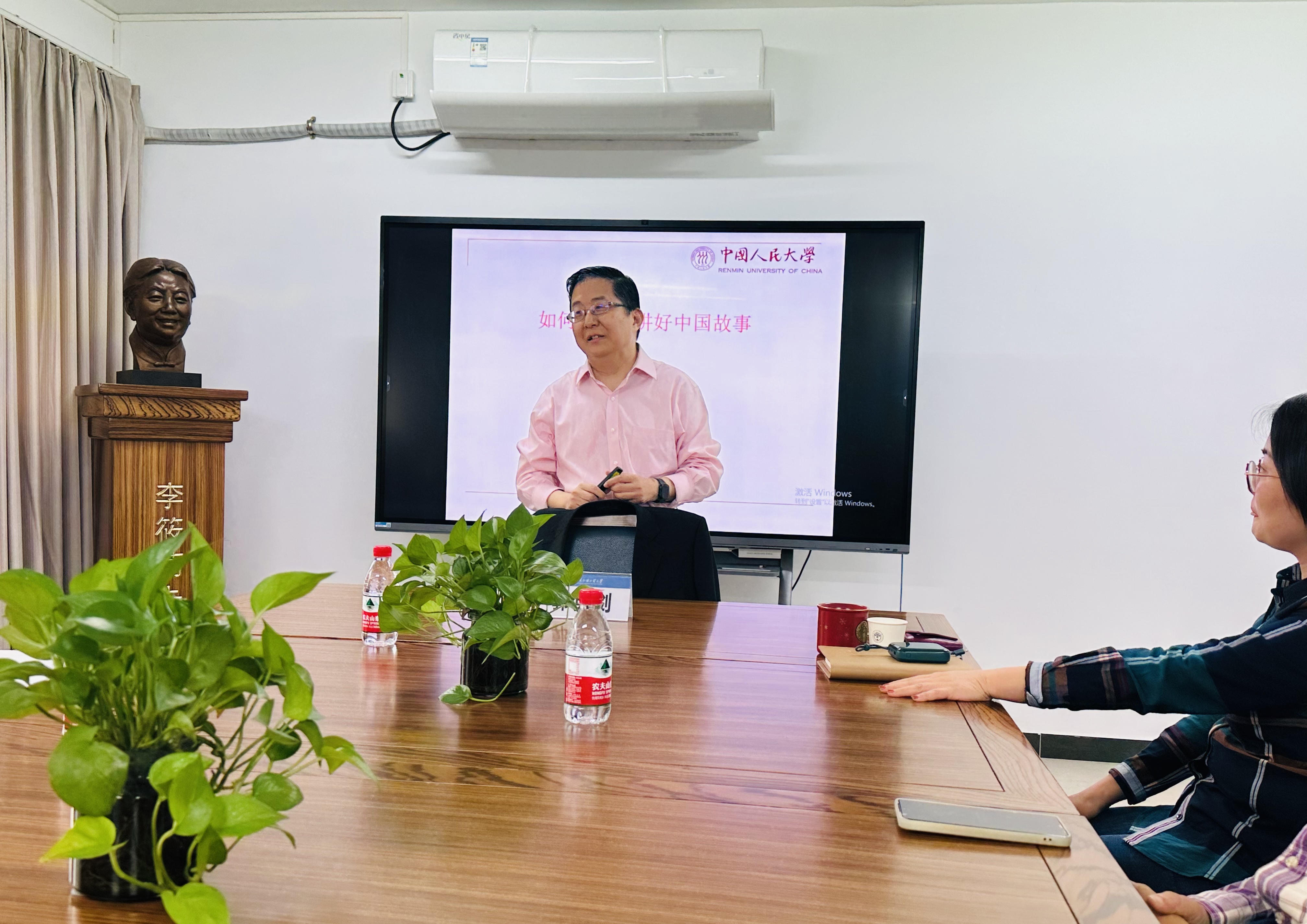 郭教授在讲座中还以自身与美国欧明道大学谈判的现实故事,赛珍珠作品中讲述的文学故事,以及自身对赛珍珠研究的学术故事为例,阐释了“究竟如何讲好中国故事”。讲座最后,郭教授还就国内对“外语专业”与“文科”的纷争,提出三个至关重要:学好英语至关重要、讲好中国故事至关重要、讲好全球故事至关重要。在交流环节中,张欣教授向郭教授请教如何做好时间管理。郭教授指出要抓住琐碎时间进行思考与写作,并借此进一步强调人文知识分子应勇于发声与写作。整个讲座氛围愉悦而深刻,与会师生受益匪浅。