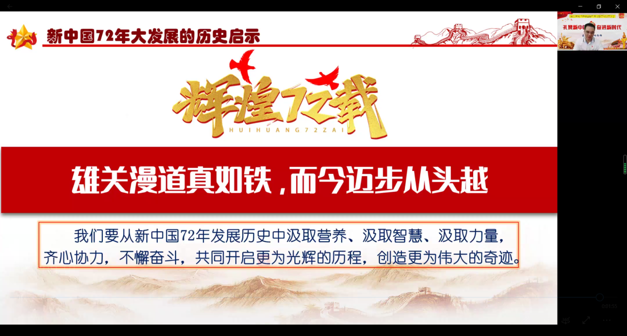 林绍雄通过播放视频的方式,带领大家领略新中国72年相继创造的经济发展、民生改善、科技进步、制度创新等方面的伟大奇迹。他表示,也正是因为这些奇迹,极大改变了中国的面貌、中华民族的面貌、中国人民的面貌、中国共产党的面貌,从而汇聚成实现中华民族伟大复兴的盛大景象。他指出,新中国72年大发展带给了我们很多的历史启示,要充分认识到新中国能够走过光辉历程、创造伟大奇迹,归根结底是因为中国共产党坚强领导的结果,是我们党不断推进马克思主义中国化的结果,是全党各族人民立足中国国情不断探索、不断奋斗、不断创新的结果。他强调,只有不忘历史、学习历史,才能不断从历史的经验和教训中汲取养分,才能为未来的发展提供强大的精神动力;只有加强对党史、新中国史的学习,才能了解中国共产党和新中国的苦难辉煌发展历程,才能明确中国共产党和新中国未来的前进方向,才能凝聚实现“中国梦”的强大力量。