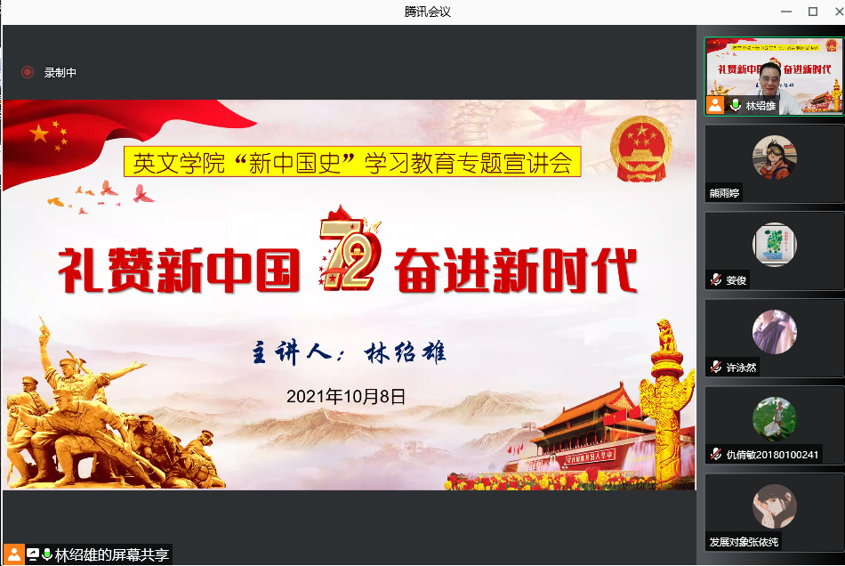 本网讯 10月8日下午,太阳成集团tyc411通过腾讯会议平台举办了“新中国史”学习教育专题宣讲会。本次宣讲由太阳成集团tyc411党委书记林绍雄主讲,学院全体教职工、员工党员和第13期党员发展对象等参加了宣讲会。