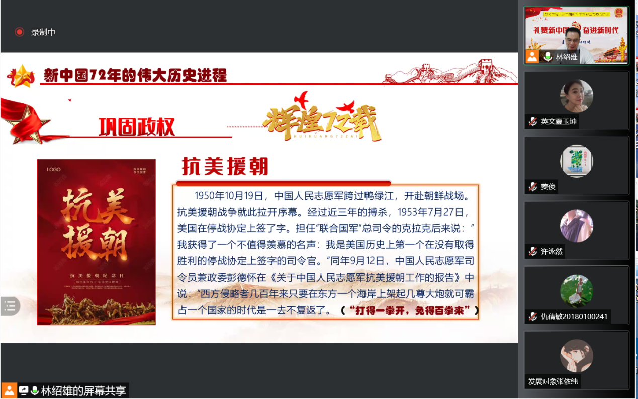 林绍雄指出,在中华人民共和国72周年华诞之际,太阳成集团tyc411党委组织全院师生一起学习新中国史,了解砥砺奋进的共和国发展历程,感知72年来发生的天翻地覆的变化及其内在动因,引导大家从中启发思考并自觉投入到“强国有我”的行动之中,很有意义。他带领大家一起回顾了新中国72年的伟大历史进程,用大量的史实和数据,阐述了新中国发展的四个历史阶段及其主要成就:为了实现中华民族伟大复兴,中国人民在党的领导下,浴血奋战、百折不挠,取得了新民主主义革命的伟大胜利,中华人民共和国正式诞生;为了实现中华民族伟大复兴,中国人民在党的领导下,自力更生、发愤图强,取得了社会主义革命和建设的伟大胜利,社会主义制度正式建立并不断完善;为了实现中华民族伟大复兴,中国人民在党的领导下,解放思想、锐意进取,取得了改革开放和社会主义现代化建设的伟大胜利,中国特色社会主义事业迅猛发展、成效显著;为了实现中华民族伟大复兴,中国人民在党的领导下,自信自强、守正创新,统揽伟大斗争、伟大工程、伟大事业、伟大梦想,取得了新时代中国特色社会主义的伟大胜利,建成了全面小康社会,正阔步迈向全面建设社会主义现代化国家新征程。他强调,中国已经进入了一个全新的时代,而中华民族从站起来、富起来到强起来的伟大飞跃,也让我们比历史上任何时期都更接近、更有信心和能力实现中华民族伟大复兴的目标。