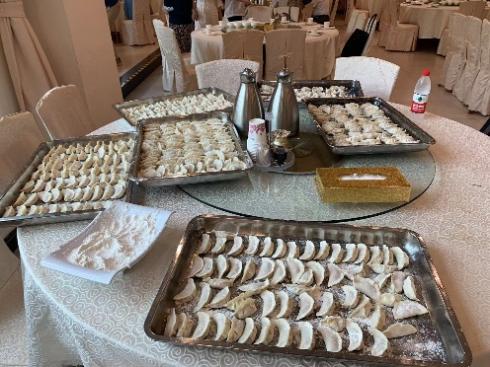 在开场包饺子的环节,学院的老师们各显其能,大家包得不亦乐乎,很快一盘盘馅料不同形状不一的饺子迅速成型。几位小朋友的踊跃加入更是让现场充满了欢乐的气氛。很快到了享用劳动成果的时候,同事们围坐在一起,高兴地享用丰盛的菜肴和饺子。大家举杯同饮,庆祝一个学期忙碌的工作顺利告一段落,假期即将开始。