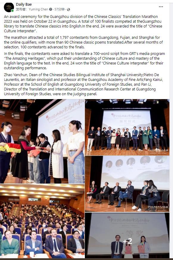 据悉,“2023 中华经典翻译马拉松”(上海赛区)的线下冲刺赛将于 10 月 29 日在上海图书馆东馆举行活动受到广东国际频道、羊城晚报等多家媒体追踪报道,广东国际频道用双语新闻进行报道,在 Facebook 专栏“Daily Bae”进行了英语推广,扩大了海外影响力。“2023中华经典翻译马拉松”赛事形式新颖,致力于助力“讲好中国故事,传承中华文化”,活动意义重大,值得高校和各界大力支持。希望未来有更多人关注和支持中华文化的翻译传播,共“译”中华经典。