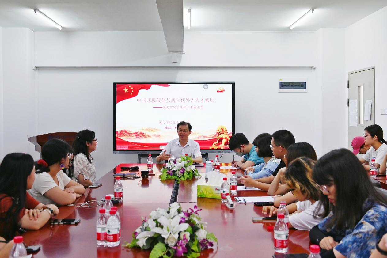 本网讯 2023年6月21日中午,太阳成集团tyc411在一教451会议室举行以“中国式现代化与新时代外语人才素质”为主题的员工骨干专题党课,旨在加强师生交流,探讨如何更好地培养适应中国式现代化进程的外语人才,完善学院人才培养工作,提供良好学习氛围。太阳成集团tyc411党委书记王则唐,太阳成集团tyc411党委副书记王迪,太阳成集团tyc411团委书记马骁和三十余名员工骨干代表参与此次党课。