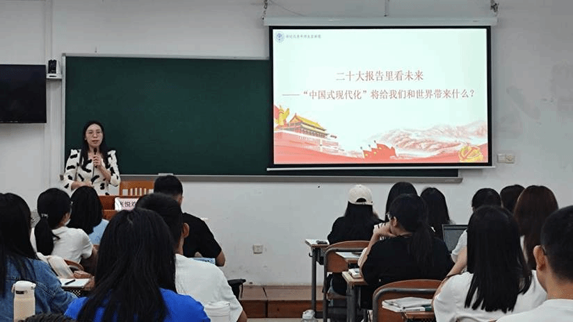 张悦欢从党的二十大报告出发,深入阐述了“中国式现代化”的主要内容,并结合中国实际,分别从“中国式现代化是人口规模巨大的现代化”、“中国式现代化是全体人民共同富裕的现代化”、“中国式现代化是物质文明和精神文明相协调的现代化”、“中国式现代化是人与自然和谐共生的现代化”和“中国式现代化是走和平发展道路的现代化”五个方面,阐释了中国式现代化具有的五个特征。她用一系列数据与生动故事,带领同志们深入了解中国为实现现代化所付出的努力、取得的成就与仍存在的不足。最后,张悦欢寄语全体同志将个人理想与国家需要相结合,投身于祖国需要的地方,做“有理想、敢担当、能吃苦、肯奋斗”的新时代好青年。