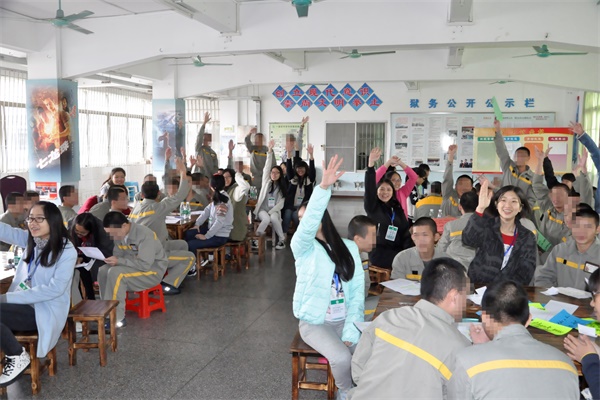 本次活动共设有节目表演、互动、教学、抒情、游戏、颁奖六个环节。在开展活动的过程中,,志愿者们亲切友善,学员们积极参与,气氛融洽。在教学与游戏环节中,学员们更是表现出极大的热情,在短短两个半小时中获益匪浅。而这次活动,也让不少第一次接触到未成年犯的志愿者们对这样一个特殊的群体有所改观。