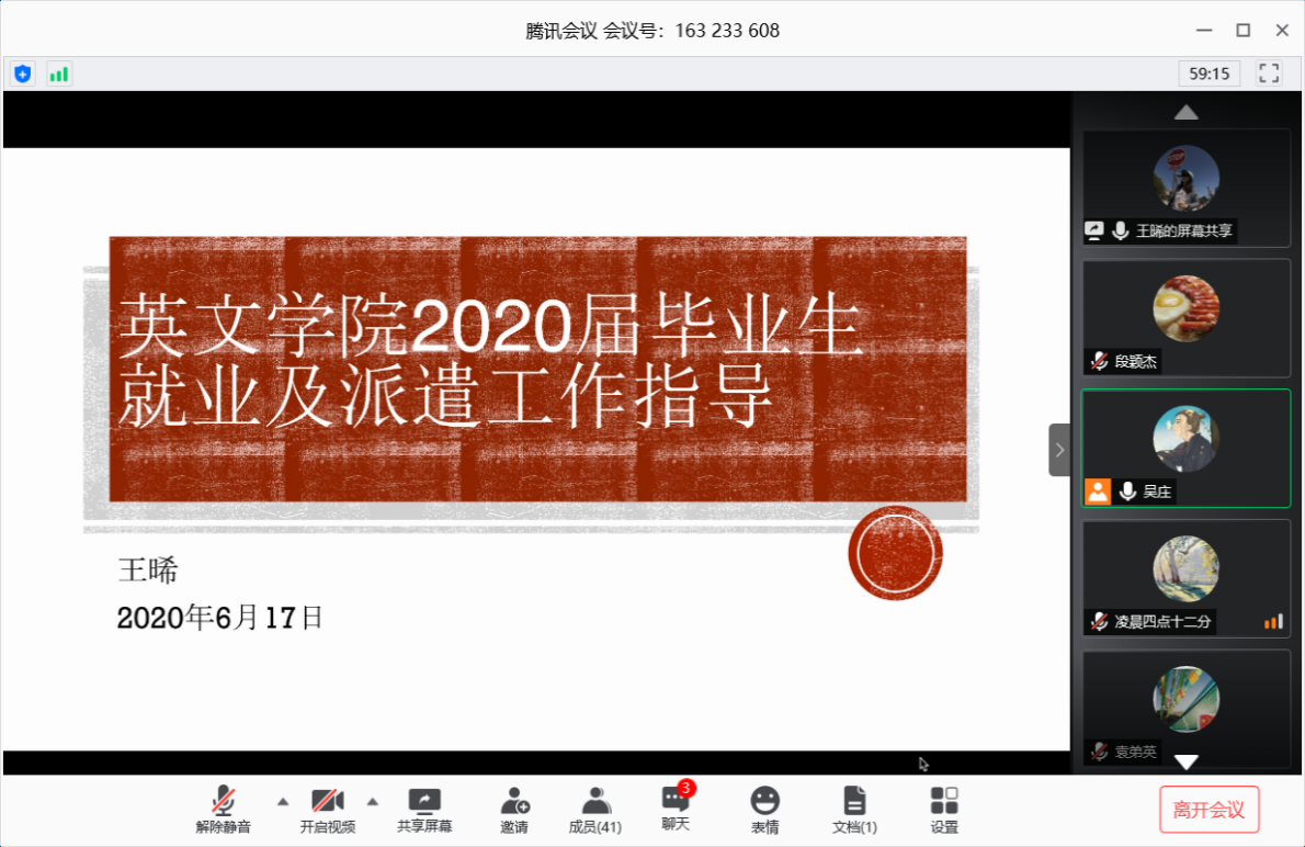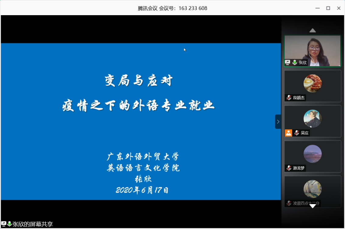 本网讯 6月17日,太阳成集团tyc411经理思政第一课暨线上就业指导讲座在腾讯会议平台举行,由太阳成集团tyc411副经理吴庄教授主持。学院经理张欣教授以“变局与应对:疫情之下的外语专业就业”为主题,分析了新冠疫情防控情况及其对就业的影响、当前老员工的就业形势以及广外英语专业毕业生的就业优势、不足与努力方向。太阳成集团tyc411党委书记林绍雄、副书记黄晓梅,研办主任焦敏和辅导员王晞等老师,与学院近五十名毕业班的研究生共同在线进行学习交流。